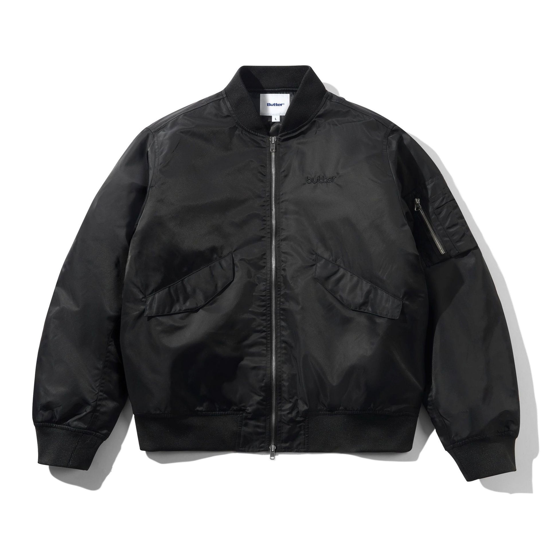 Butter Goods Bomber Jacket Classic bomber silhouette crafted with quality construction. Features a structured fit, ribbed cuffs and hem, and a front zip closure. Perfect for layering or wearing solo. Versatile enough for casual everyday wear or dressing up your outfit.